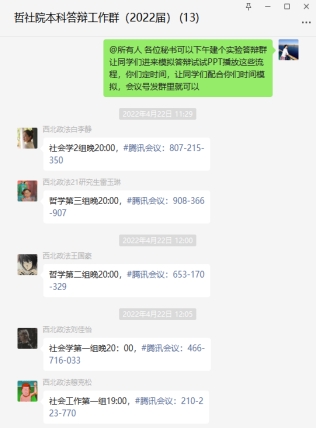 教务办在马雪莲副院长的带领下进行了周密的策划部署和模拟演练,具体步骤有:提前一周收集答辩学生的准备材料、教务秘书线上组织答辩秘书进行流程培训、组织学生提前进行模拟答辩、向答辩组成员教师发布注意事项等。以上准备工作成功排除了部分学生的设备故障、提升了学生们线上讲解PPT及答辩的操作熟练度、优化了答辩流程。