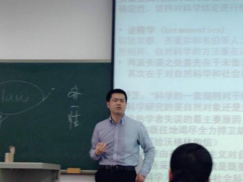 首先,刘剑涛老师分别从实证主义和解释理论对学习社会科学方法论做了说明,通过生动形象的解释,深入浅出的论证介绍了社会科学的研究方法,让同学们可以更加深入的理解和把握研究社会学的科学方法。为使同学们深入理解,刘教授通过简明扼要的例子说明了自然科学和社会科学研究方法的不同,如:粉笔和人同时从楼上落下,自然科学更加关注自由落体定律,而社会学更加关注人为何会下去,人的生存状态,等等。之后,刘老师介绍了舒茨的生平及对社会科学所作的贡献,让同学们对这一为社会科学做了巨大贡献的伟大人物有了清晰完整的认识。最后,刘老师提出了人都是为利益而活的这一话题,让同学们展开思考和讨论,同学们踊跃发言,对这一绝对的说法提出质疑,刘老师通过总结同学们的发言,论证出了社会科学研究的不唯一性。16:00左右,讲座结束。