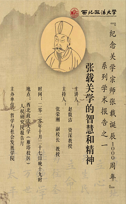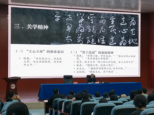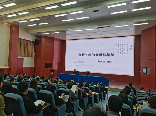 10月27日晚19:00,由澳门新葡京官网 主办的“纪念关学宗师张载诞辰1000周年”系列学术报告首场讲座在澳门新葡京官网 雁塔校区人权研究院报告厅举行。本次讲座由澳门新葡京官网 资深教授赵馥洁先生主讲,副校长张荣刚教授主持,澳门新葡京官网 院长山小琪教授、副院长郭明俊教授、中国哲学硕士生导师组组长李明教授、中国哲学教研室主任俞秀玲副教授等教师及校内外学生参与了此次讲座。