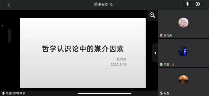 张兴娟博士的报告题目是“哲学认识论中的媒介因素”。张兴娟博士的报告从界定认识论概念媒介概念入手,讨论了在认识论中从认识主体到认识对象之间的媒介因素,进而认为哲学认识论中的媒介应该被重新重视。张兴娟分析了哲学史上一些经典认识论案例所包含的媒介因素,包括柏拉图的“洞喻”、培根的“四假象”和笛卡尔“普遍怀疑论”;她指出在传统哲学认识论中,媒介被当作“噪音”去除,从而忽略了媒介的积极作用。最后,张兴娟博士肯定了当代解释学中对媒介的重视,并呼吁在哲学认识论中要重视媒介的积极作用。
