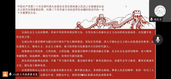 程欣月同学首先带领大家深刻学习领会了二十大精神内涵,重点学习与讨论了“高举中国特色社会主义伟大旗帜,全面贯彻习近平新时代中国特色社会主义思想,弘扬伟大建党精神,自信自强、守正创新,踔厉奋发、勇毅前行,为全面建设社会主义现代化国家、全面推进中华民族伟大复兴而团结奋斗”的二十大主题。