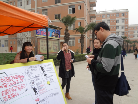 3月13日——17日在专业课靳宇老师的统一安排下,2012级社会工作专业学生积极准备,通过澳门新葡京官网 的广播站合作及校园广播,广播站的微信、微博、人人官方平台,赢起一定的点击量,在活动开展前通过板报宣传,印发关于社会工作的知识的宣传页,在3月17日澳门新葡京官网 宿舍区定点开展社工基本知识宣传与社工常识有奖竞答、签名纪念等活动,取得良好的宣传效果。
