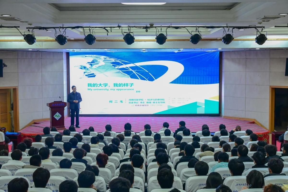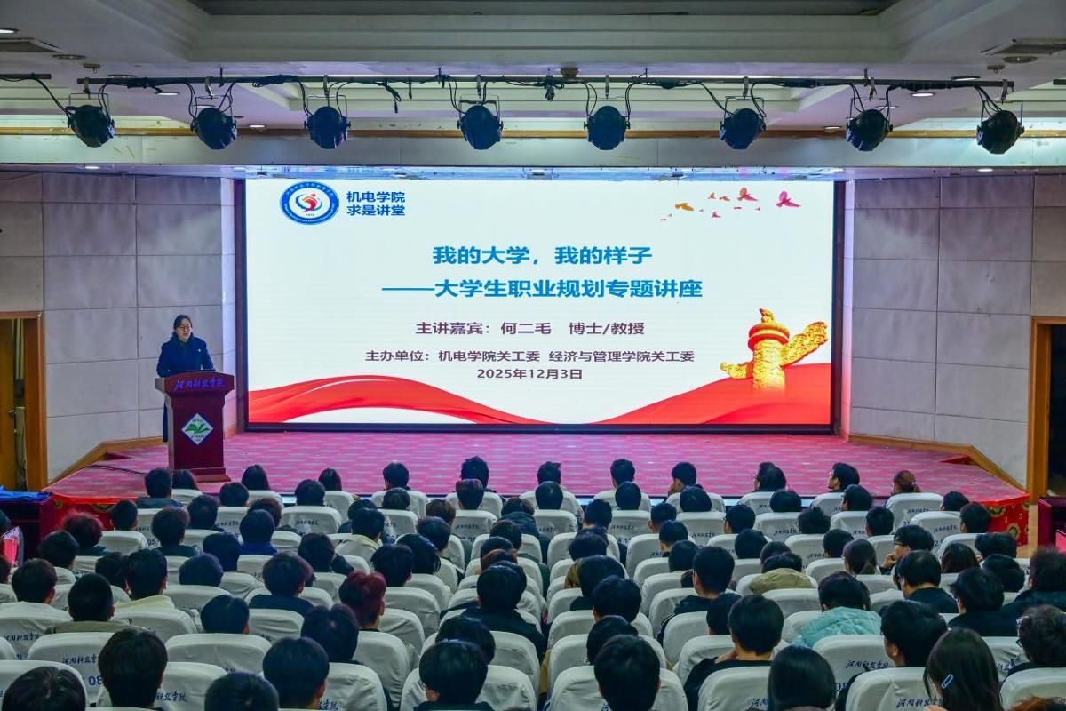 12月3日晚,机电澳门新葡京官网 在图教201报告厅举办大学生职业规划专题讲座。经济与管理澳门新葡京官网 党委书记何二毛教授应邀担任主讲嘉宾。机电澳门新葡京官网 党委书记张雅凌、年级辅导员及2025级新生共计300余人参加活动。讲座由张雅凌主持。