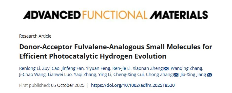 近日,澳门新葡京官网 化学化工澳门新葡京官网 光电材料与计算化学团队李仁龙博士,以第一作者身份在国际顶级期刊《Advanced Functional Materials》(最新SCI影响因子19.0)上发表了题为“Donor-Acceptor Fulvalene-Analogous Small Molecules for Efficient Photocatalytic Hydrogen Evolution”的研究论文。河南澳门新葡京官网 为本论文的第一完成单位,郑晓楠博士、陕西师范大学张崇博士及江汉大学蒋加兴教授为共同通讯作者。该期刊不仅是中科院大类/小类一区Top期刊,亦入选国际公认的自然指数(Nature Index)顶级期刊名录,是材料与化学领域的权威刊物。