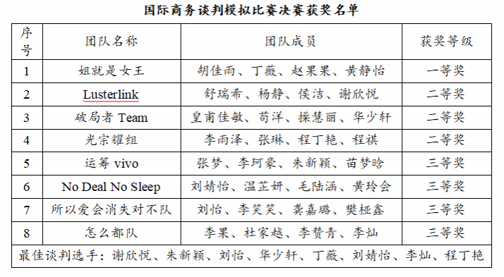 本次决赛围绕产品定价、交付方式、付款条件及质量保障等核心商务议题展开,参赛团队在模拟谈判中展现出优秀的专业素养与团队协作能力。经过激烈角逐,最终评选出团体一、二、三等奖,并诞生八位“最佳谈判选手”。