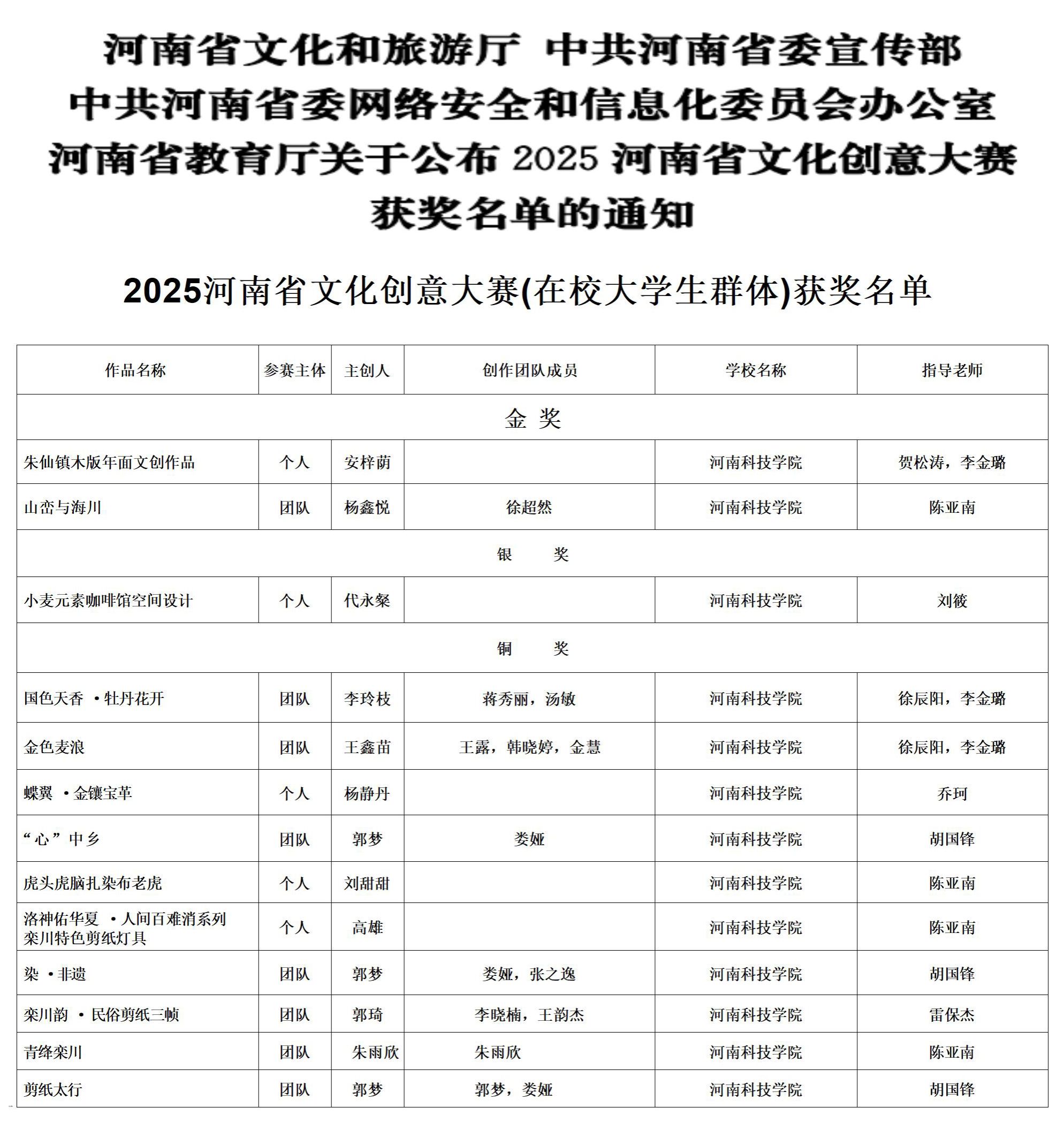 近日,由河南省文化和旅游厅、中共河南省委宣传部、中共河南省委网络安全和信息化委员会办公室、河南省教育厅联合举办的2025河南省文化创意大赛公布获奖名单。澳门新葡京官网 获得金奖2项,银奖1项,铜奖10项。