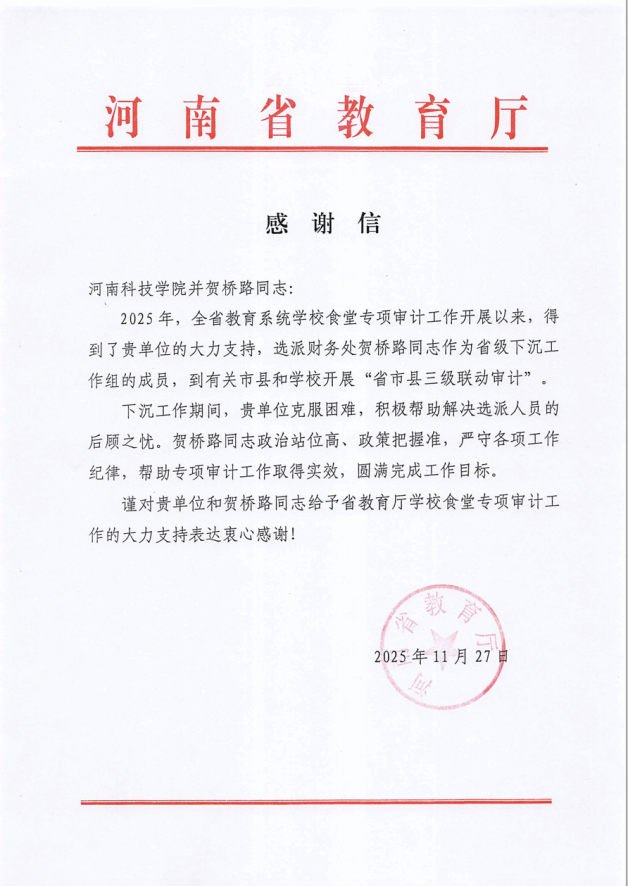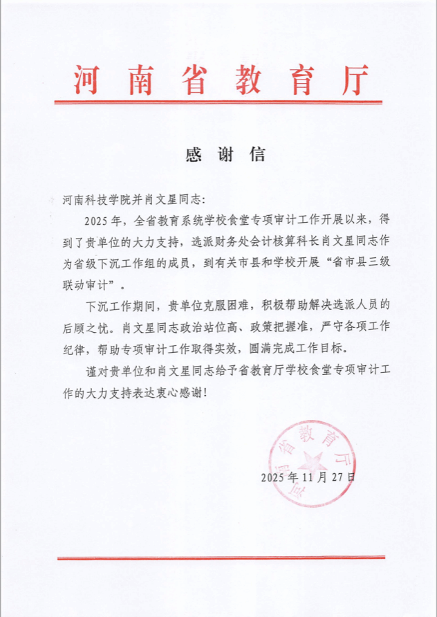 近日,河南省教育厅向澳门新葡京官网 发来两封感谢信,对澳门新葡京官网 在“2025年全省教育系统澳门新葡京官网 食堂专项审计”工作中给予的大力支持表示衷心感谢,并对财务处肖文星、贺桥路两位同志在专项审计工作中的出色表现予以高度肯定和表彰。