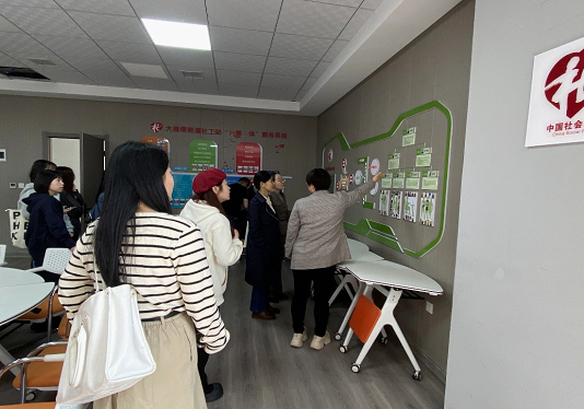 调研团队实地参观了大雁塔街道社工站的场地建设、示范项目展区,听取了社工站工作人员有关社工站建设发展、组织架构、“六位一体”服务系统和工作服务流程等方面的介绍。
